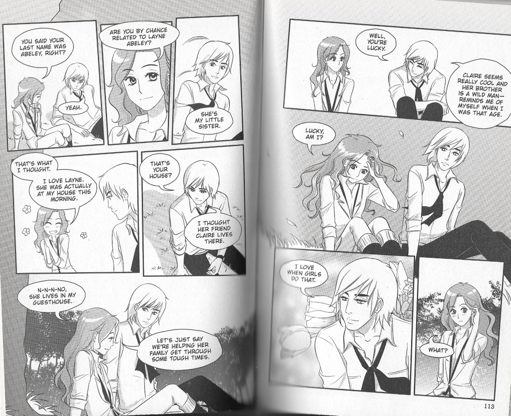A prime example of Chris Abeley flirting with Massie (47:31) from the manga. In the novel version Massie is putting her hair in a bun in this scene, but the illustrator simply chose to give Massie…head lice?